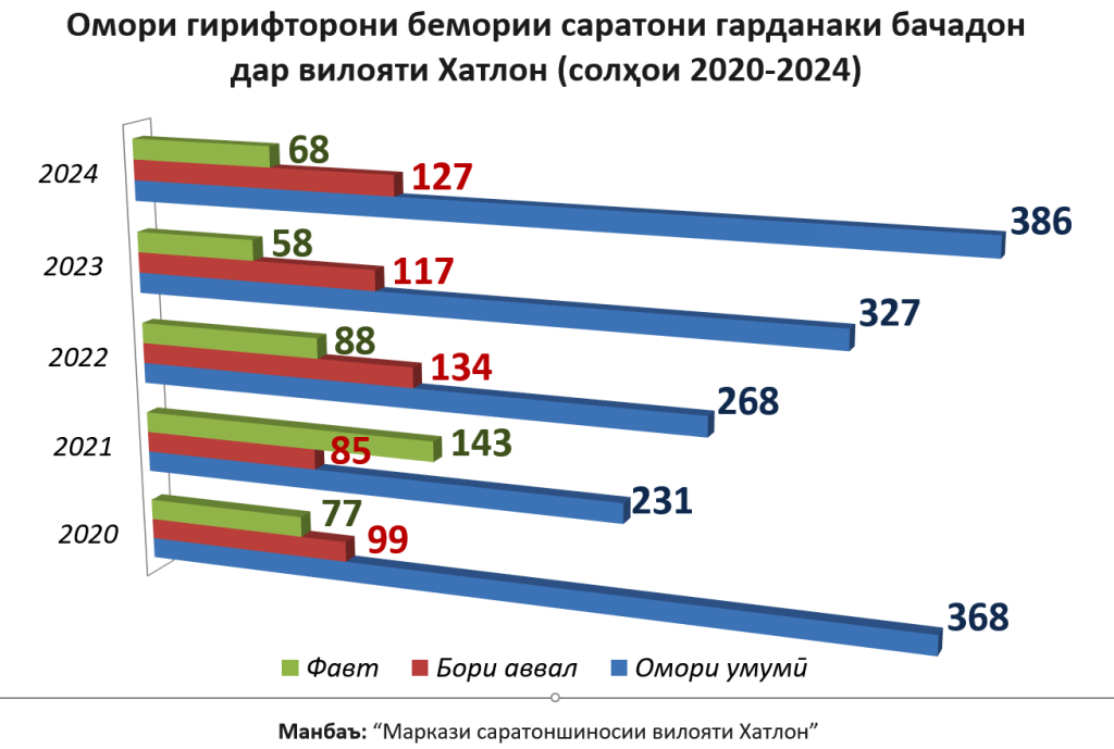 Ба қавли табиби “Маркази саратоншиносии вилояти Хатлон” Обида Сотиболдиева, соли 2024 дар ин марказ 386 бемори саратони гарданаки бачадон ба қайд гирифта шудааст, ки аз ин теъдод 127 нафараш бори аввал аст. Мутаассифона, аз ин беморӣ 68 нафар занон фавтидаанд.